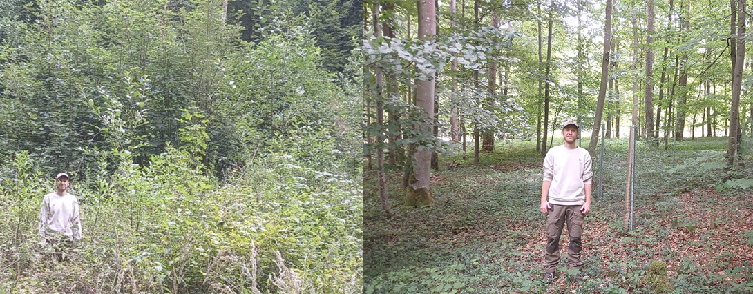 Durchgeführt wurde die Studie über einen Zeitraum von vier Jahren im Würzburger Universitätswald. Dazu legten die Forschenden jeweils eine eingezäunte und eine nicht eingezäunte Fläche von 36 Quadratmetern sowohl in künstlich geschaffenen Kronenlücken als auch in schattigen, geschlossenen Waldbereichen an.
