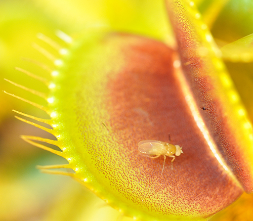 The trap's insides are covered by a turf of red glands. This flower-like appearance combined with fruity smells attracts many insects. Looking for nectar, the visitors inevitably touch the three sensor hairs located on each of the lobes. Based on the number of times the trigger hair is stimulated, the plant decides whether to snap the trap closed and start digestion. This means that the plant is capable of counting.